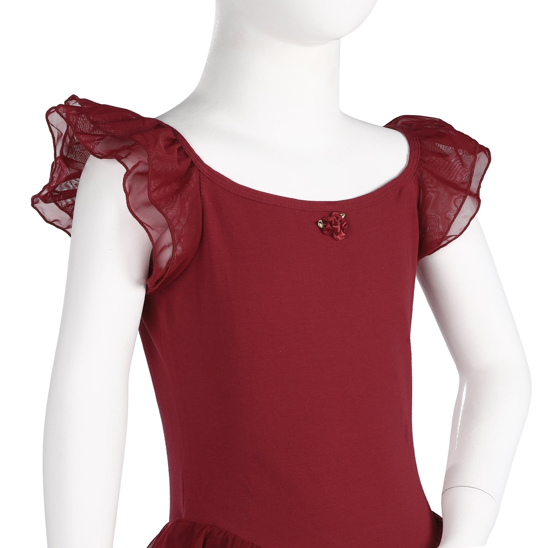 弾力性があり、柔らかい素材のバレエレオタード。サイズやカラーが豊富なのでキッズからティーンズまで幅広い年齢のお子様にご使用いただけます。胸元にはバラの飾り付。袖やスカートにもふんわりフリル付で踊りを華やかに見せてくれます。